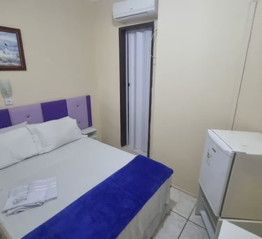 Quarto aconchegante com cama de casal e ar-condicionado.